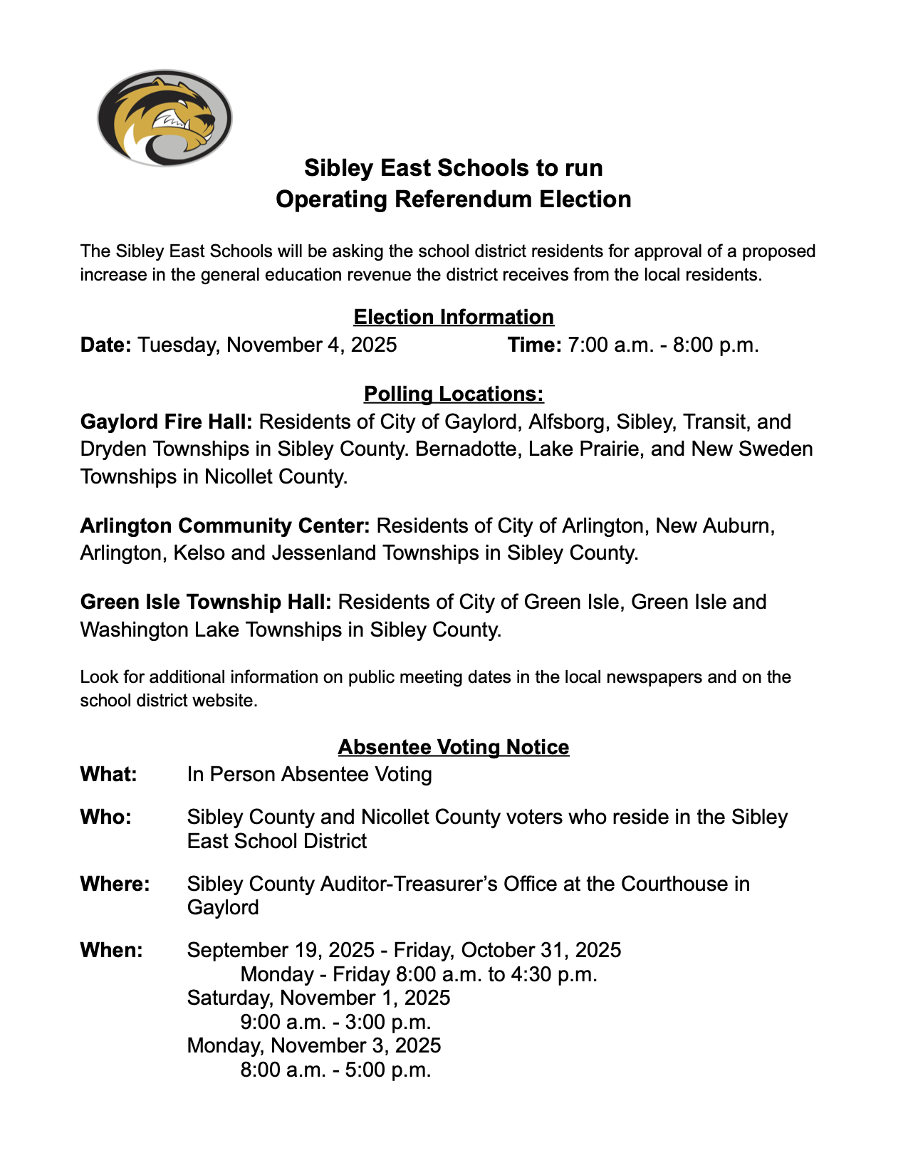 Sibley East Schools will be hosting an informational meeting in Green Isle for school district residents desiring to learn more about the November 4th operating referendum election. The meeting will be held on Monday, October 6, 2025 beginning at 7:00 p.m. in the St. Paul’s Lutheran Church Fellowship Hall.